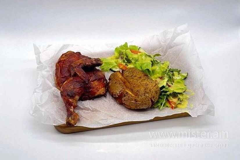 Півкурча запечене з соусом BBQ, картопля, мікс салату.