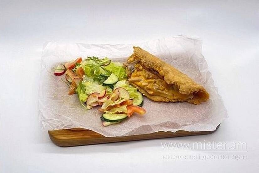 Такос курячий, кукурудза, бекон, сир чеддер, вершки, печериці, мікс салату.