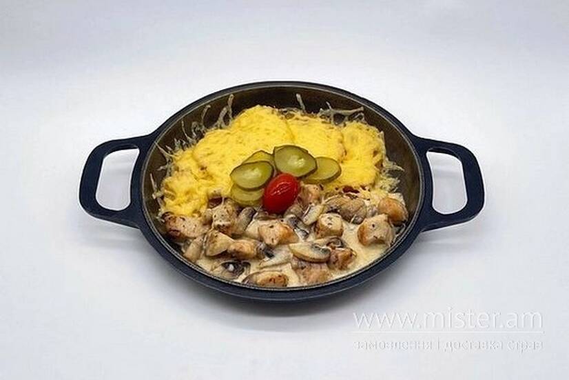 Шматочки курячого філе та грибів смажені у соусі, запечені з картоплею під сиром.