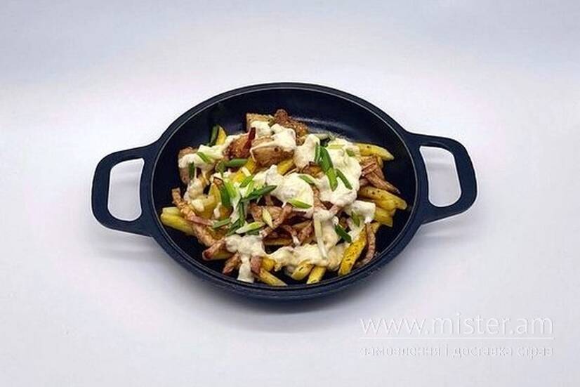 Картопля фрі, куряче філе, сир, вершки, бекон