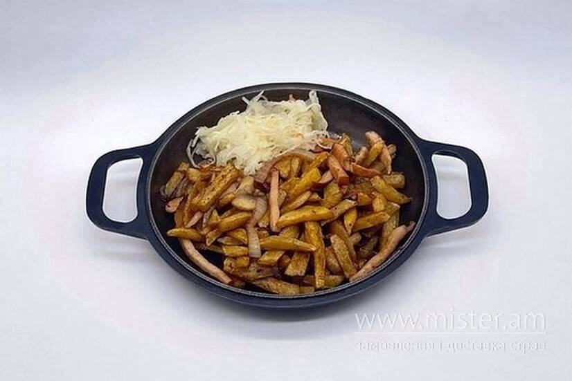 Смажена картопля, гриби, бекон, цибуля, квашена капуста.