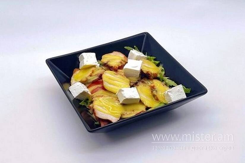 Куряче філе, бекон, сир фета, лист салату, рукола, томати, лимонна заправка.