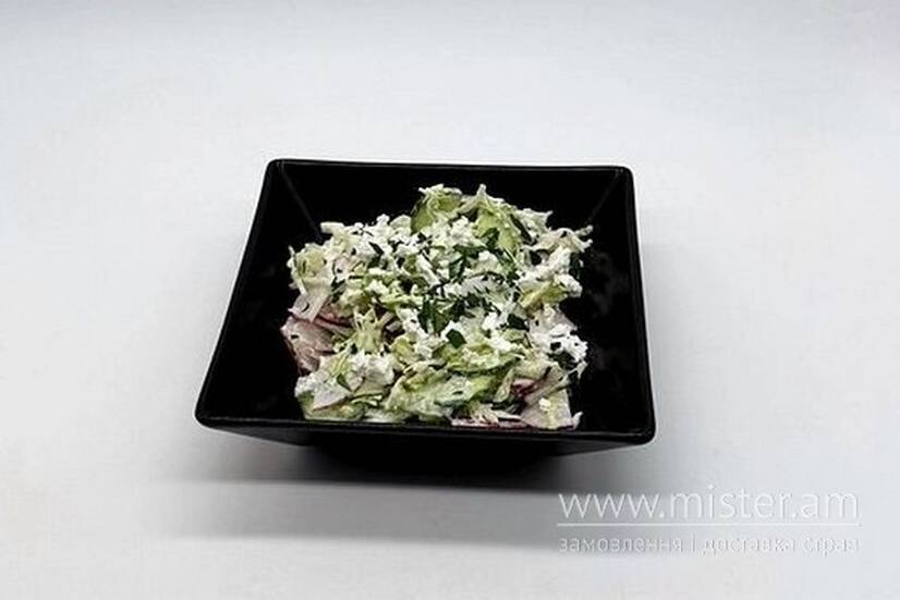 Капуста молода, редис, огірок, сметана, фета, зелень.