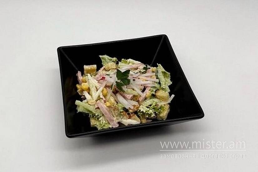 Лист салату, кукурудза, яйце, огірок, шинка, редис, майонез, зелень, крутони.