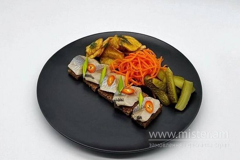 Темний хліб, оселедець, корнішони, морква по-корейськи, картопля, зелена цибуля та перець чилі.