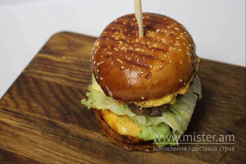 Соковита котлета з яловичини, подвійний сир Чеддер, обсмажений бекон, цибуля карамелізована, Соус барбекю та булочка власного виробництва.