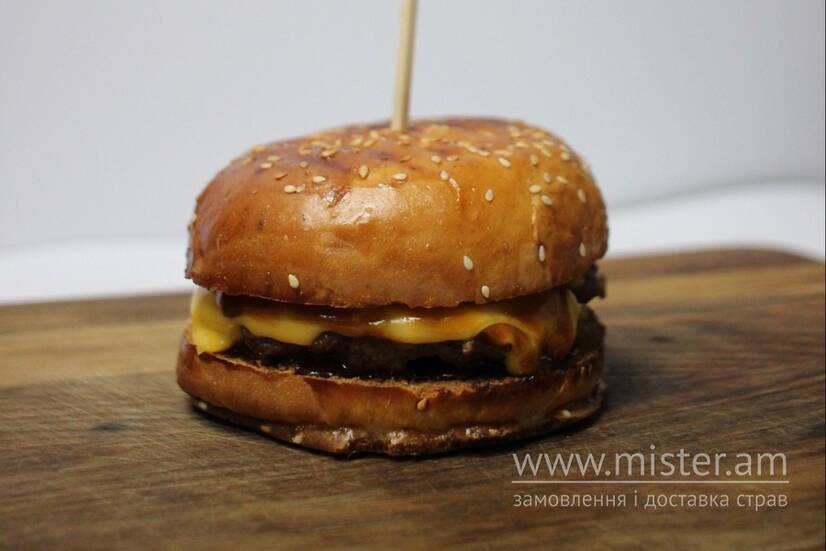 Обсмажене куряче філе, сир Чеддер, свіжий огірок, помідор, лист салату, Соус для бургера та булочка власного виробництва.