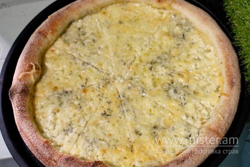 Сир Моцарела, сир Гауда, сир Дор-блю, сир Пармезан, соус білий.