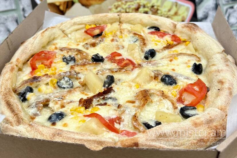 Ніжне куряче філе, ананас, помідор, маслини, кукурудза, сир Моцарела, соус білий.