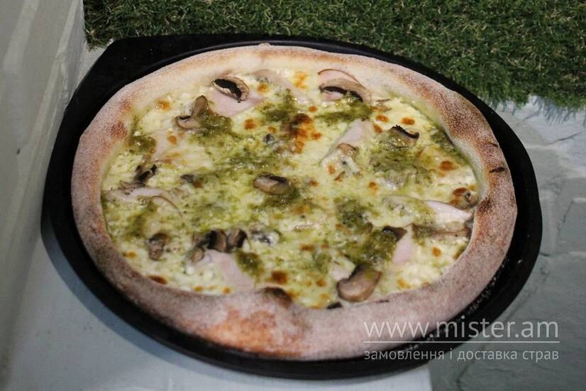 Ніжне куряче філе, шинка, гриби Печериці, сир Моцарела, соус білий, соус Песто.