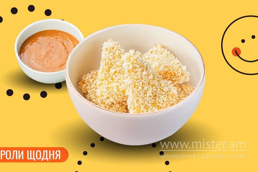 Моцарела, яйце, панірувальні сухарі, борошно темпура, соус горіховий (гострий).