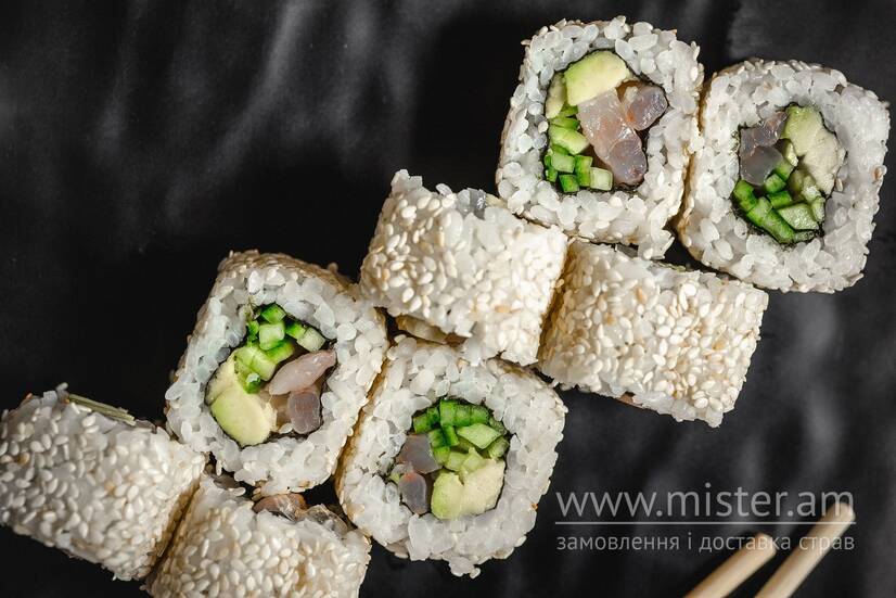 Креветка, кунжут, авокадо, огірок, японський майонез.