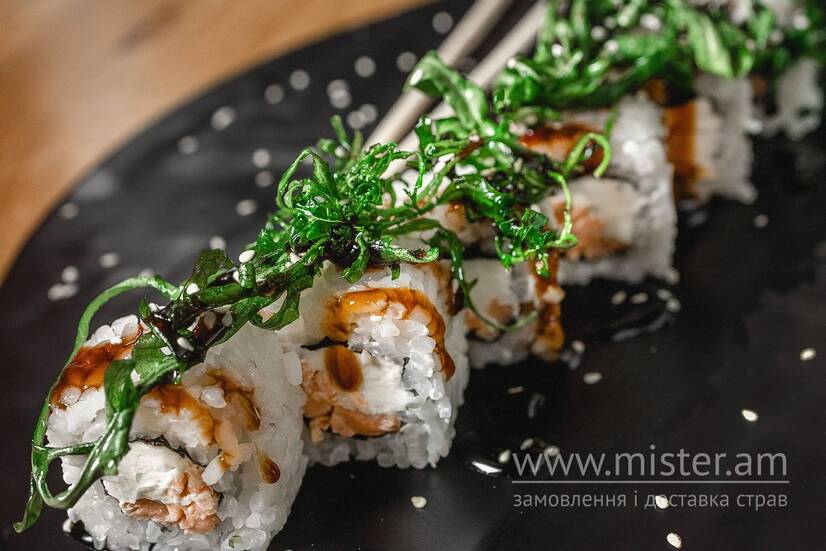 Вугор, лосось, сир Філадельфія, огірок, кунжут, соус унагі.