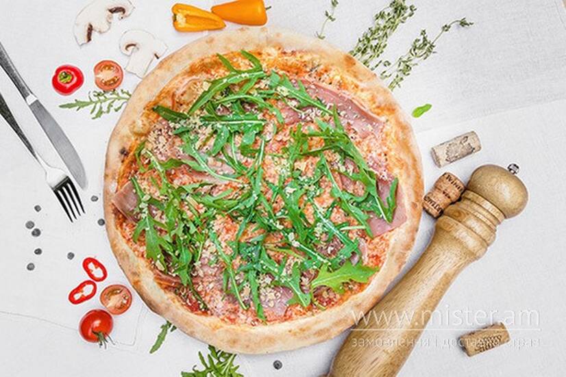 Помідоровий соус, моцарелла, прошутто крудо, руккола, пармезан.