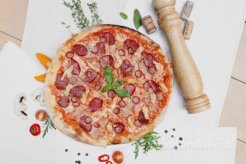 Помідоровий соус, моцарелла, cалямі, шинка, курка, ковбаски баварські.