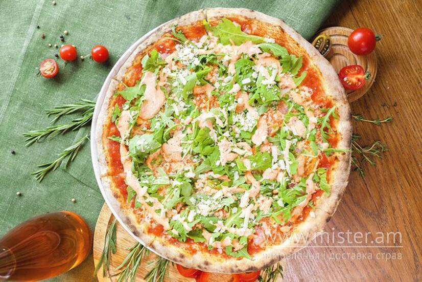 Помідоровий соус, моцарелла, креветки, руккола, пармезан, соус “Сальса роса”.