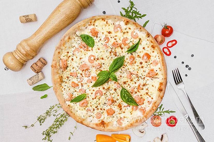 Без вершкового соусу, моцарелла, сьомга, креветки, базилік.