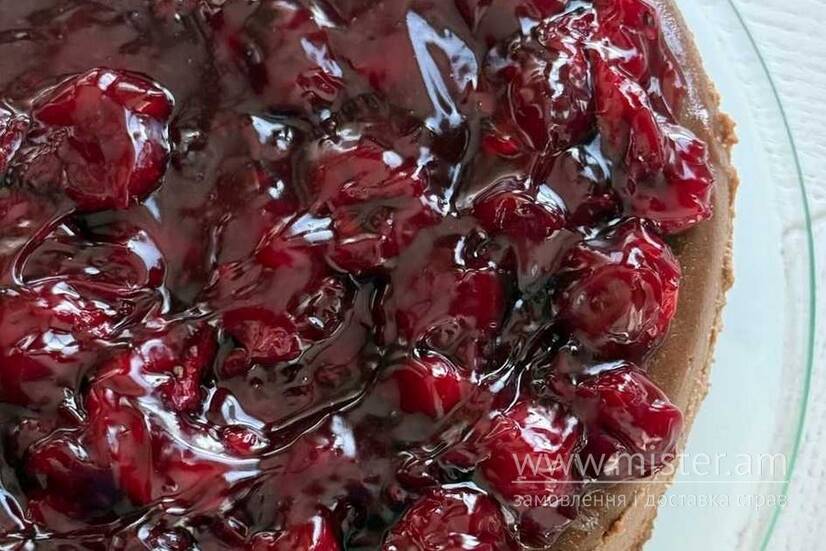 Ніжний шоколадний чізкейк з вершковою текстурою, вкритий стиглими вишнями. Гармонія солодкого та кислинки, яка закохує з першого шматочка.
