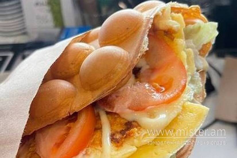 Гонконгська вафля з омлетом – ніжний омлет із моцарелою, доповнений айсбергом, свіжим помідором та фірмовим соусом "Цезар" для ситного перекусу.