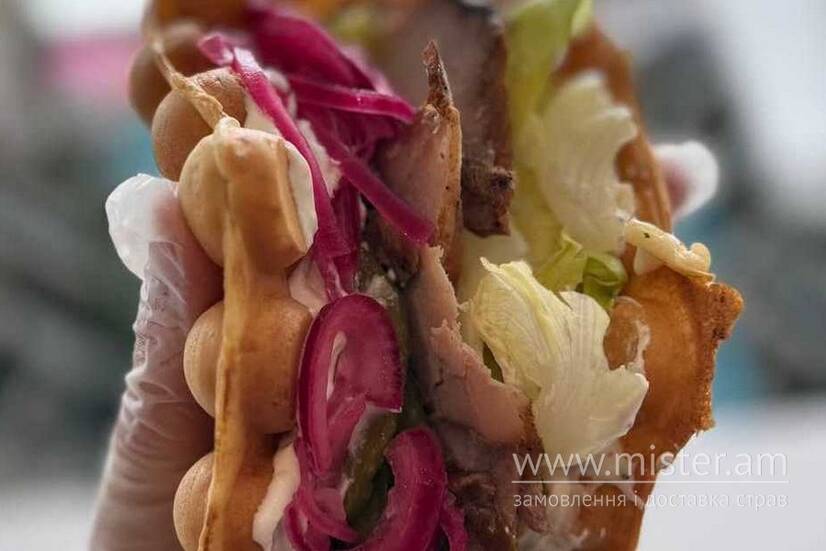 Гонконгська вафля по-селянськи – соковита буженина, мариновані огірки та цибуля, свіжий айсберг і сметанковий соус власного приготування дарують насичений домашній смак.