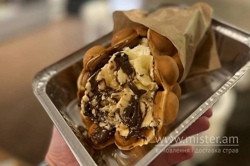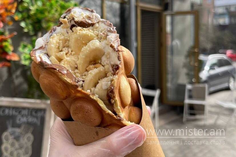 Гонконгська вафля з бананом і шоколадом – стиглий банан, ніжна шоколадна паста, крем-чиз на основі сиру "Філадельфія" та хрусткий арахіс створюють ідеальне поєднання смаків.