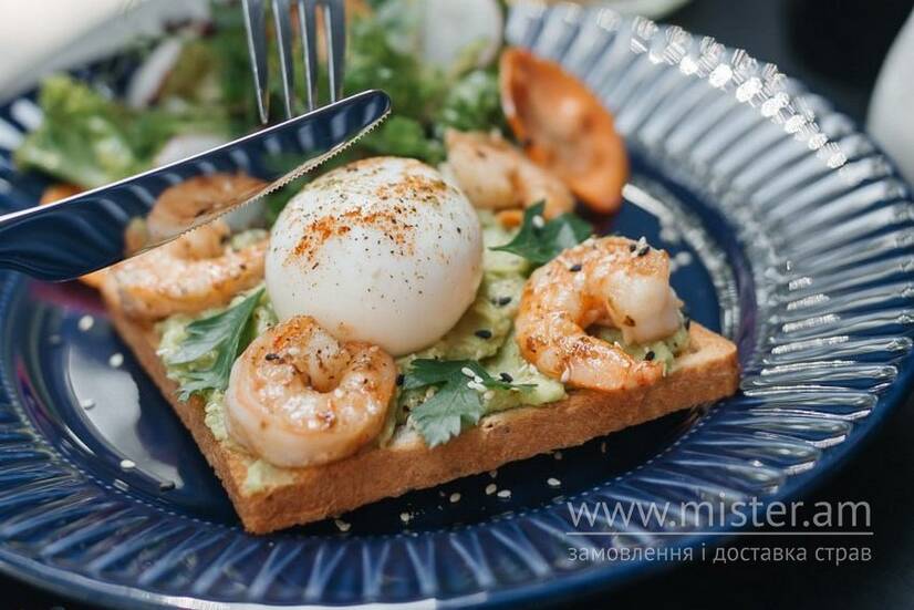 Крок мадам з авокадо на ніжній скибці бріош з креветкою чи лососем