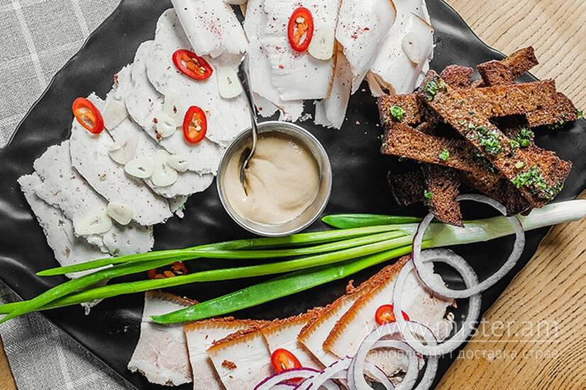 Телятина, ковбаса домашня, бочок, буженина, часник маринований, хрін, гірчиця.