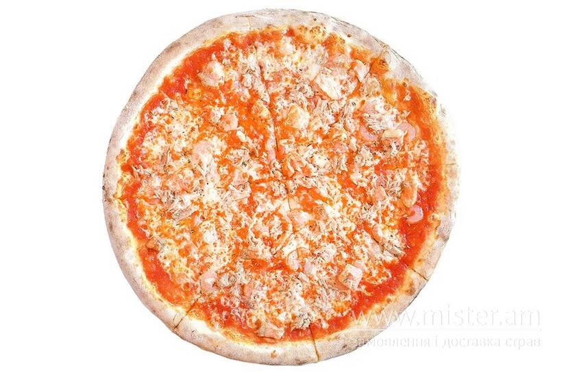 Помідоровий соус, моцарелла, креветки, сьомга, тунець, базилік.