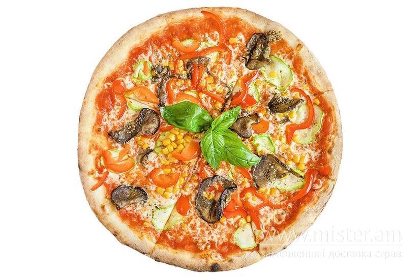 Помідоровий соус, моцарелла, баклажани, цукіні, перець болгарський, кукурудза, базилік.