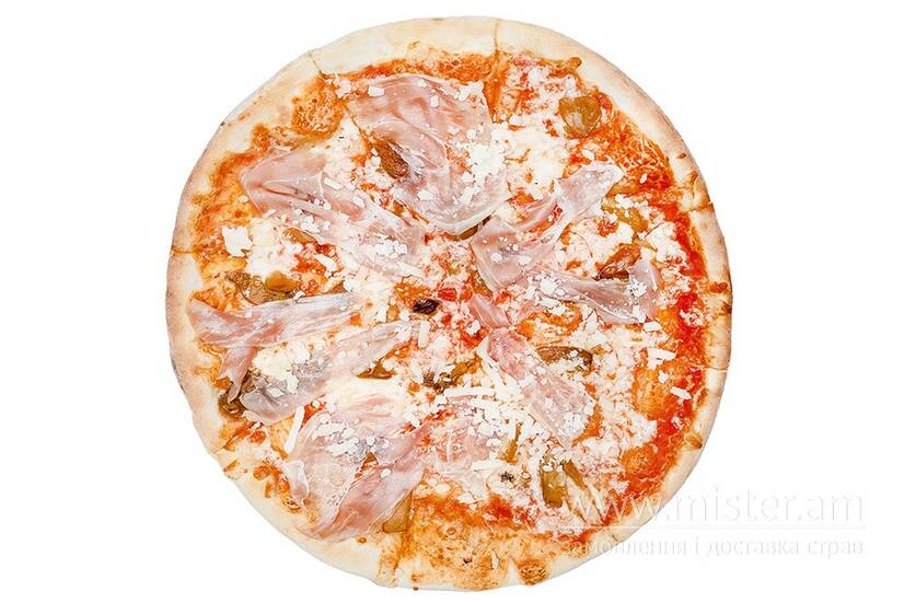 Помідоровий соус, моцарелла, прошутто крудо, гриби білі.