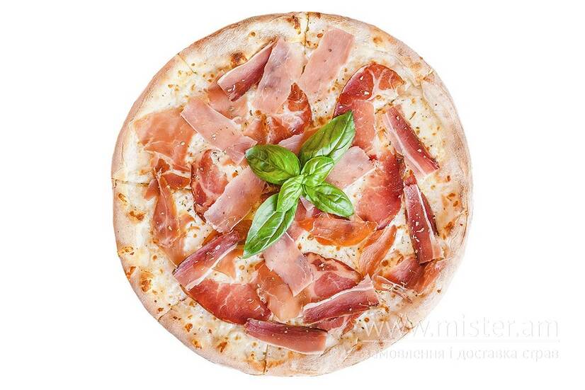 Вершковий соус, моцарелла, прошутто крудо, спек, лонза, базилік.