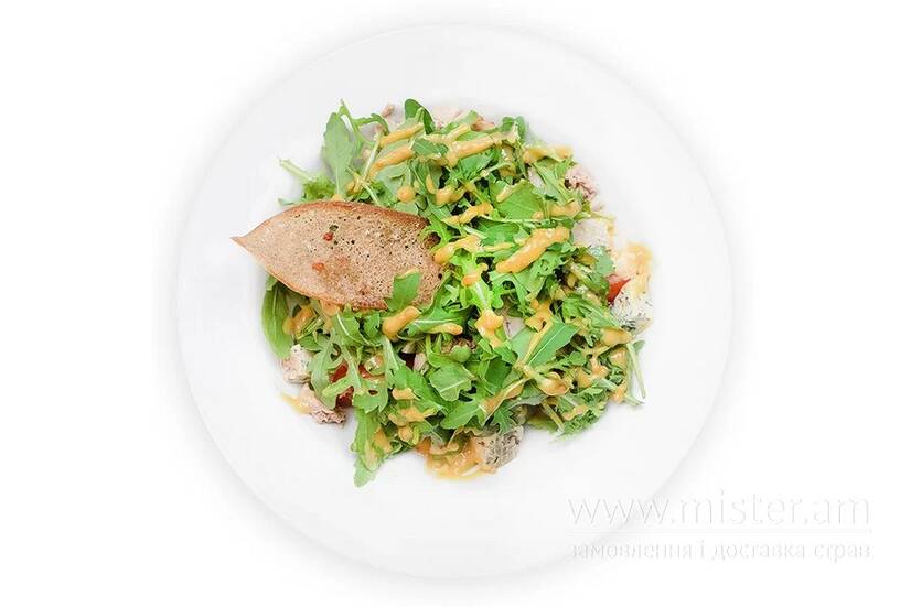 Курка, тунець, горгонзола, помідори, руккола, цибуля, хлібні чіпси, гірчичний соус.