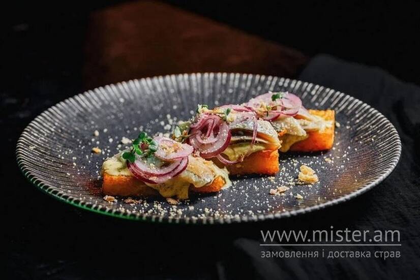 На хрусткій картоплі з соусом тар-тар та маринованою цибулею.