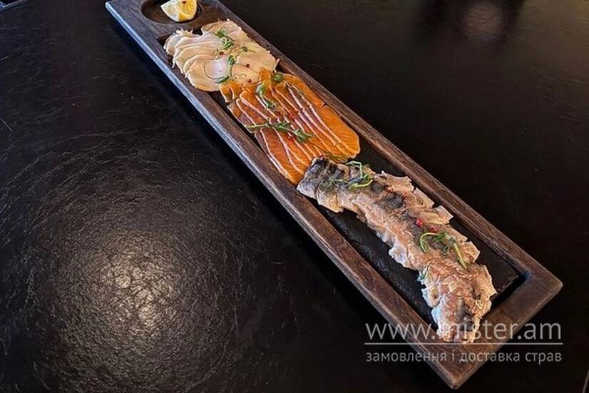Вишукана холодна закуска з чотирьох видів риби: лосось гравлакс, пікантна маринована скумбрія, делікатна масляна риба та копчена ікра тріски. Подається з долькою свіжого лимона, щоб підкреслити яскравий смак кожного шматочка.