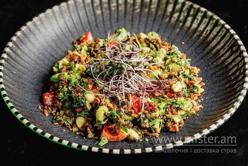 Хрусткий рис з овочами та зеленню, збалансований горіховими нотами й пікантним спайсі-соусом.
