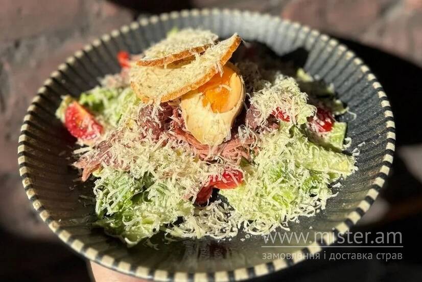 Бедро індика, томати, яйце куряче мариноване, листя салату, грінки , соус з додаванням трюфельної пасти.