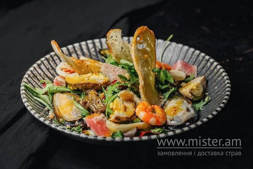 Мікс салату, яйце мариноване, тунець, креветка, мідії, кальмар, восьминіг, сушена ікра тріски, соус тонатто.