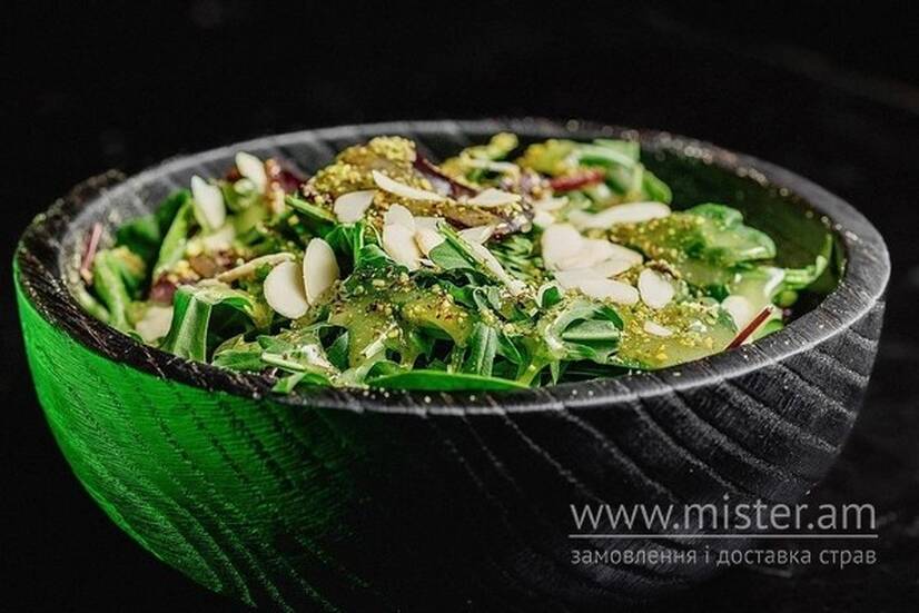 Хрусткий айсберг і добірний мікс свіжої зелені у ніжному поєднанні з легкою йогуртовою заправкою та витонченим медовим дресінгом. Завершує смак мікс горіхів, що додає акценту.