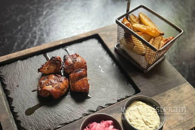 Шашлик із курячого стегна в лемонграсі, подаємо із печеною картоплею, маринованою цибулею та соусами: чімічурі та тар тар.