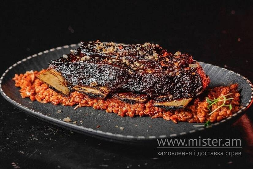 Вагова позиція від 400 грам. Яловиче ребро зі смокера, запікається зі сливовою глазурью. Подаємо з таргонею ( домашнє тісто приготовлене за методикою різотто, з великою кількістю копченої паприки).