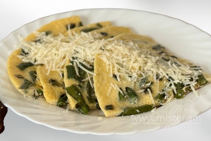 Соковита італійська фрітата з ніжною спаржевою квасолею, курячим яйцем та молоком. Доповнена ароматним часником, зеленою цибулею, пармезаном та шматочками мультизернового хліба для ситності. Б/Ж/В 26.3/37/33,7.