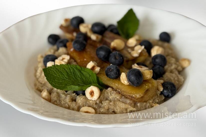 Легка кіноа, зварена на ароматному кокосовому молоці, поєднана з насінням чіа та свіжою лохиною. Родзинка страви – солодкий карамелізований банан, підсмажений фундук і освіжаючі листочки м`яти. Б/Ж/В 10,9/35,8/65,4.
