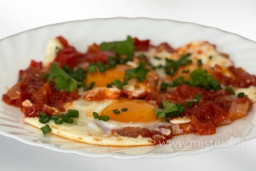 Апетитна шакшука з ніжними яйцями, солодким болгарським перцем та соковитими томатами. Страва ароматизована цибулею, спеціями та зеленою приправою, подається з хрустким зерновим хлібом. Б/Ж/В 19/26.5/34.