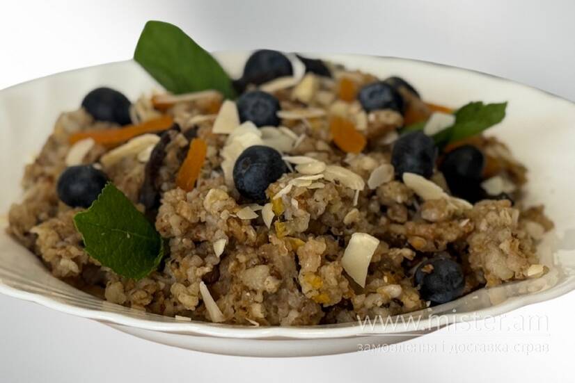 Поживна каша з дев`яти злаків у поєднанні з ароматною курагою та ніжним чорносливом. Доповнена свіжою лохиною, рослинними вершками, мигдалевими пластівцями та листочками м`яти. Б/Ж/В 12,9/15,4/98,7.