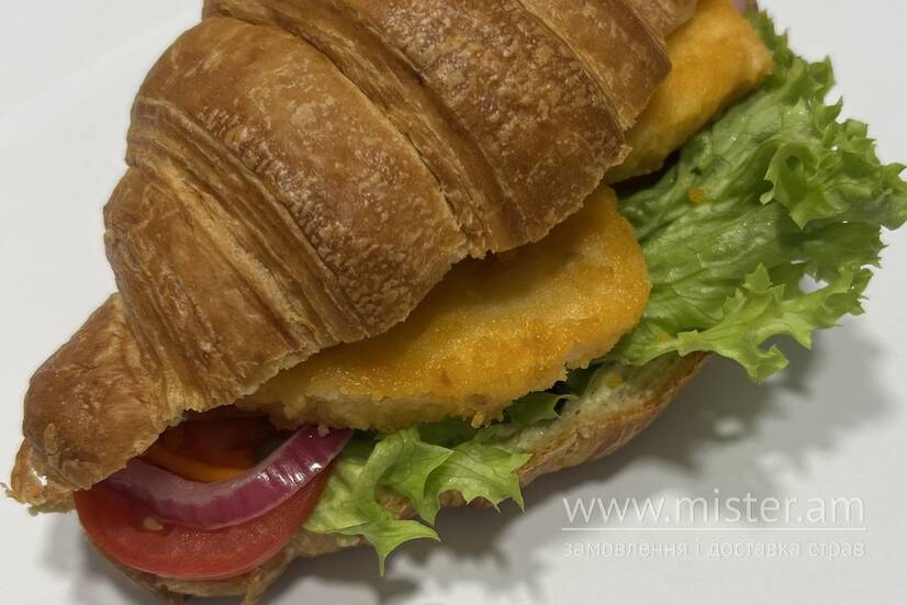 Круасан із хрусткими курячими нагетсами, свіжим листям салату та соковитим помідором.