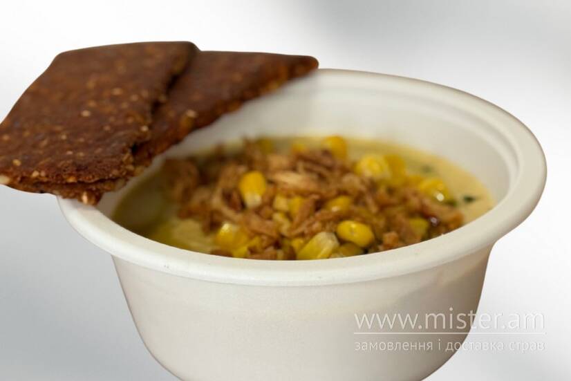 Ніжний крем-суп із солодкої кукурудзи з додаванням моркви, цибулі та томатної пасти. Рослинні вершки надають йому кремової текстури, а суміш насіння (кунжут, гарбуз, льон, соняшник) та ароматні спеції створюють багатий смак. Б/Ж/В 14,4/51,5/73,5.