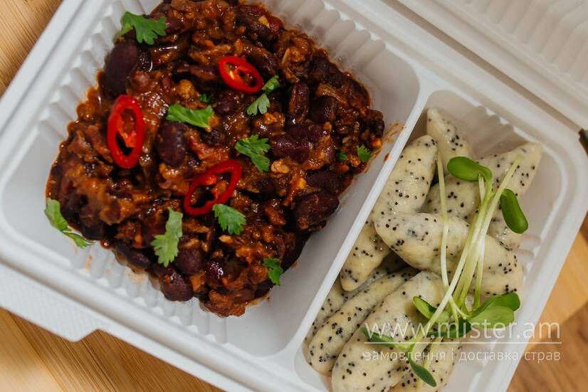 Ситна грузинська страва з червоної квасолі та рослинного фаршу в томатному соусі. Доповнена зразами з картоплі, ароматним часником, цибулею, перцем чилі та зеленню кінзи. Завершальний акцент – мікрогрін і ніжний присмак макового насіння. Б/Ж/В 24,2/25,2/62,4.