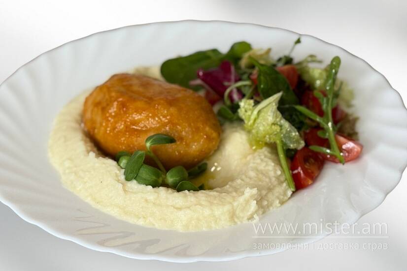 Ніжне картопляно-селерове пюре з трюфельною олією та рослинними вершками у поєднанні з соковитою котлетою по-Київськи (з рослинних інгридієнтів). Страва подається з міксом салату, помідорами чері та легким лимонним соусом. Б/Ж/В 19,8/31,5/42,9.
