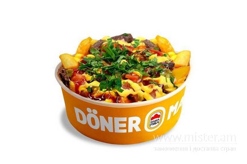 Добірна картопелька, засмажена у фритюрі та підсолена у поєднанні з ніжною курочкою "Наша Ряба", свіжий помідорчик, огірочки та маринована цибулька - все це приправлене бургерним і фірмовим авторським соусом та свіженькою петрушкою.