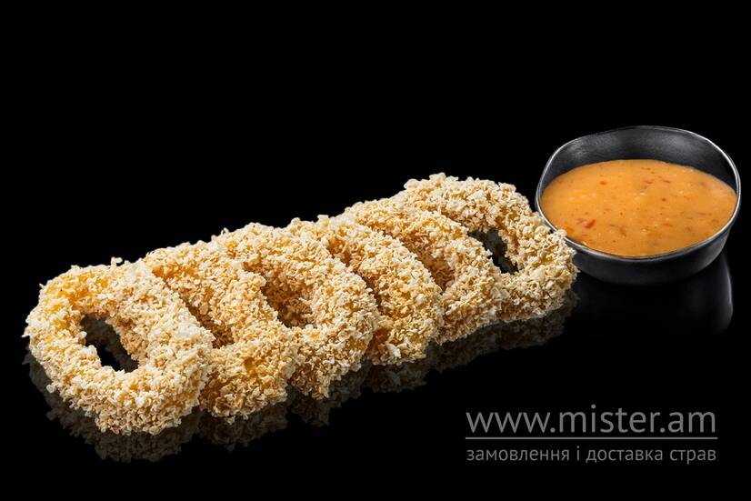 Кальмар, кляр темпура, сухарі панко, борошно темпура, соус Світ Чилі.